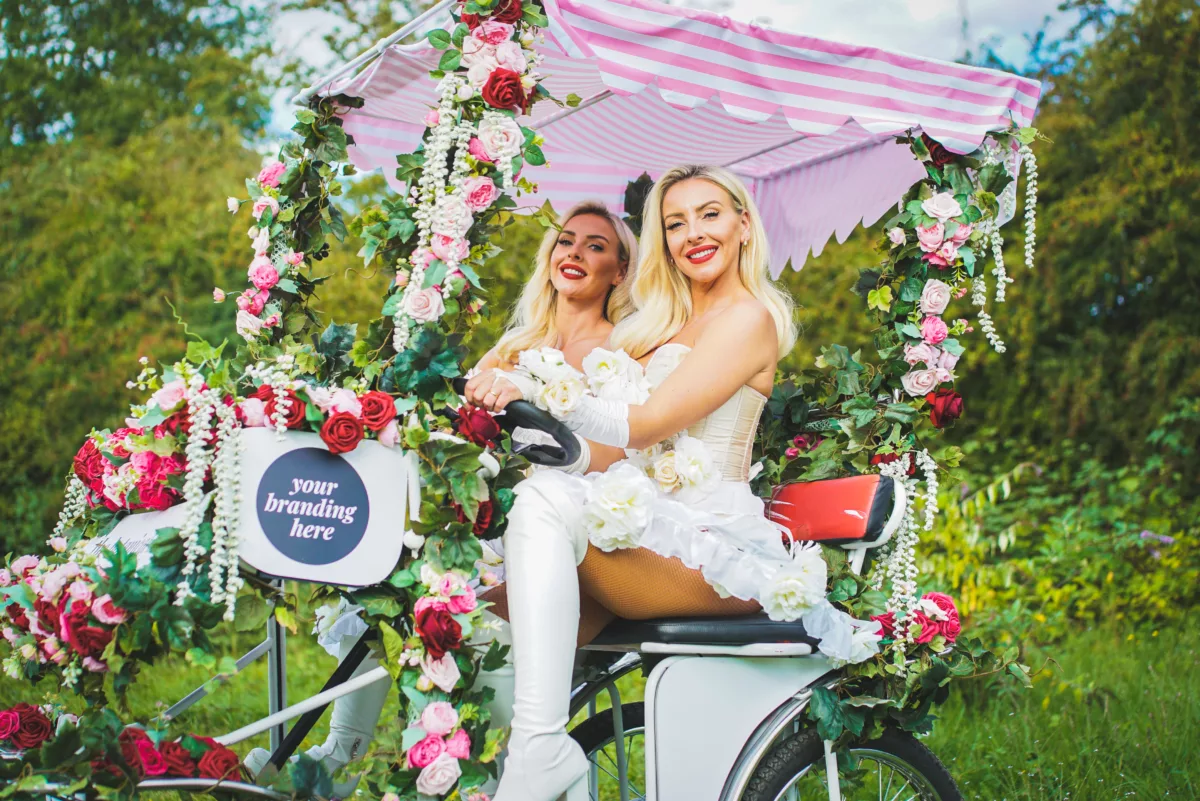 To enhance the overall experience, the act comes with two thematically dressed Promotional Models who are poised to engage with your guests. These models not only strike charming poses for memorable photos on the bike but also serve a touch of effervescence, topping up guests’ glasses from bottles of champagne neatly stored and displayed in the front basket of the bike.