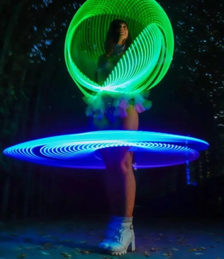 - The skilled performer gracefully twirls eight LED hula hoops simultaneously on different parts of their body, creating a dazzling display of multi-tasking prowess, leaving the audience in awe as the vibrant lights of the LED hoops paint a tapestry of colours in the dimly lit room, providing a visual feast that is both stunning and unforgettable.